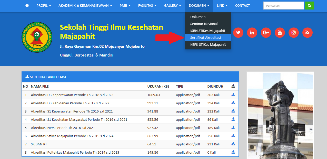 Sertifikat akreditasi baik prodi maupun institusi dapat di unduh melalui website STIKes Majapahit di alamat stikesmajapahit.ac.id. Pada menu Dokumen > Sertifikat Akreditasi.